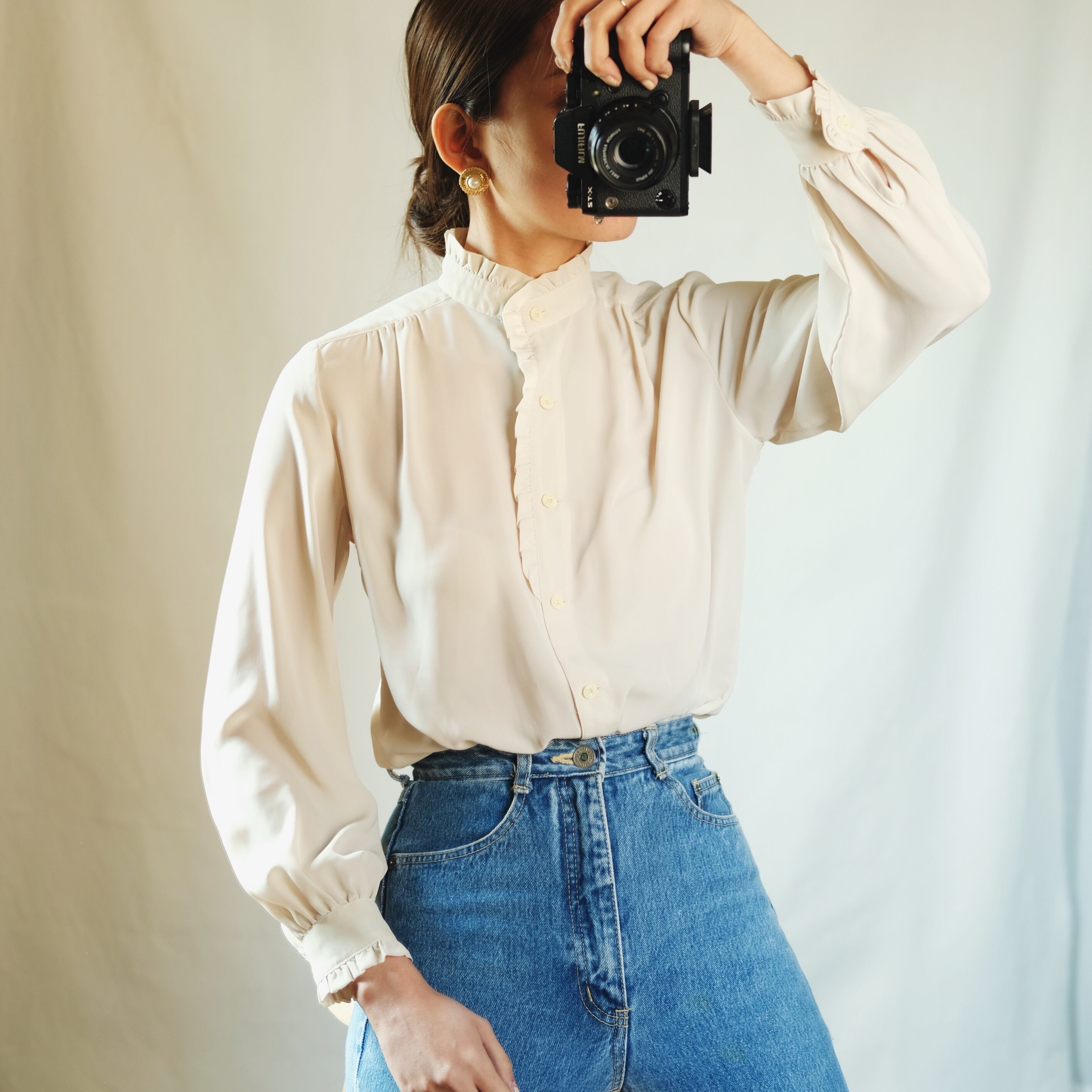 すごく素敵なブラウスなんですが、背中側の一番下の部分にシミがついています。スタイル、ボトムの中にインしたりすれば見えなくなると思います。